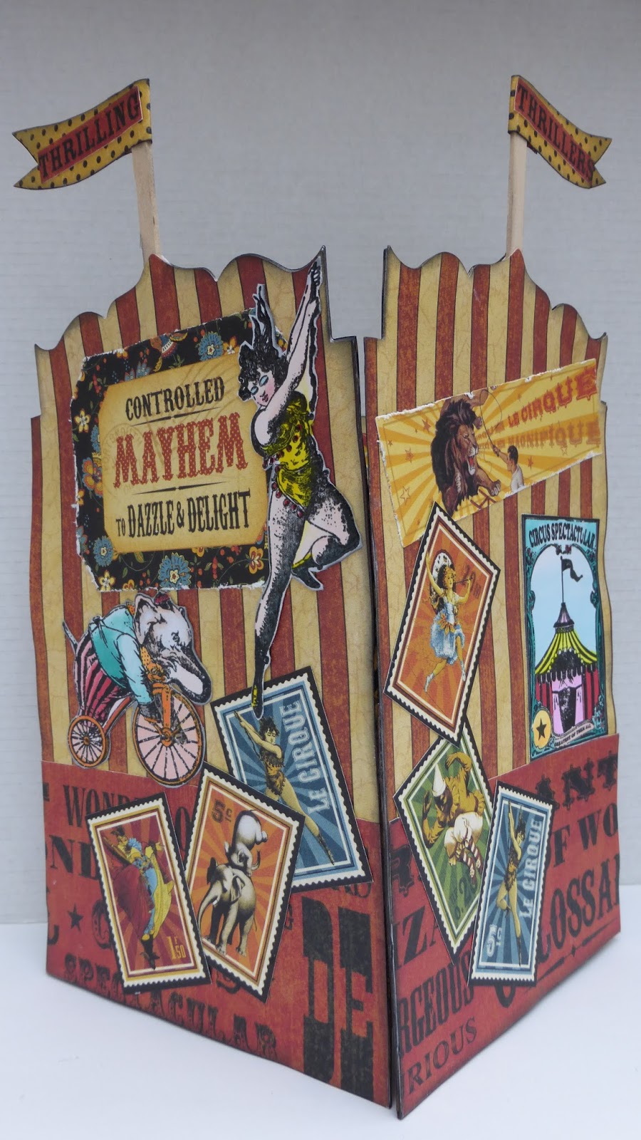 - When the tabs are put in place it causes the card to have a bend at the front which acts as a stand and looks like the circus ring (well I think it does anyway).