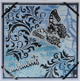 The butterfly was stamped onto card and Velum and heat embossed, white glitter on one and black on the other. I mounted the two butterflies on top of each other to give some depth to the card after adding black and white brads to the body section.