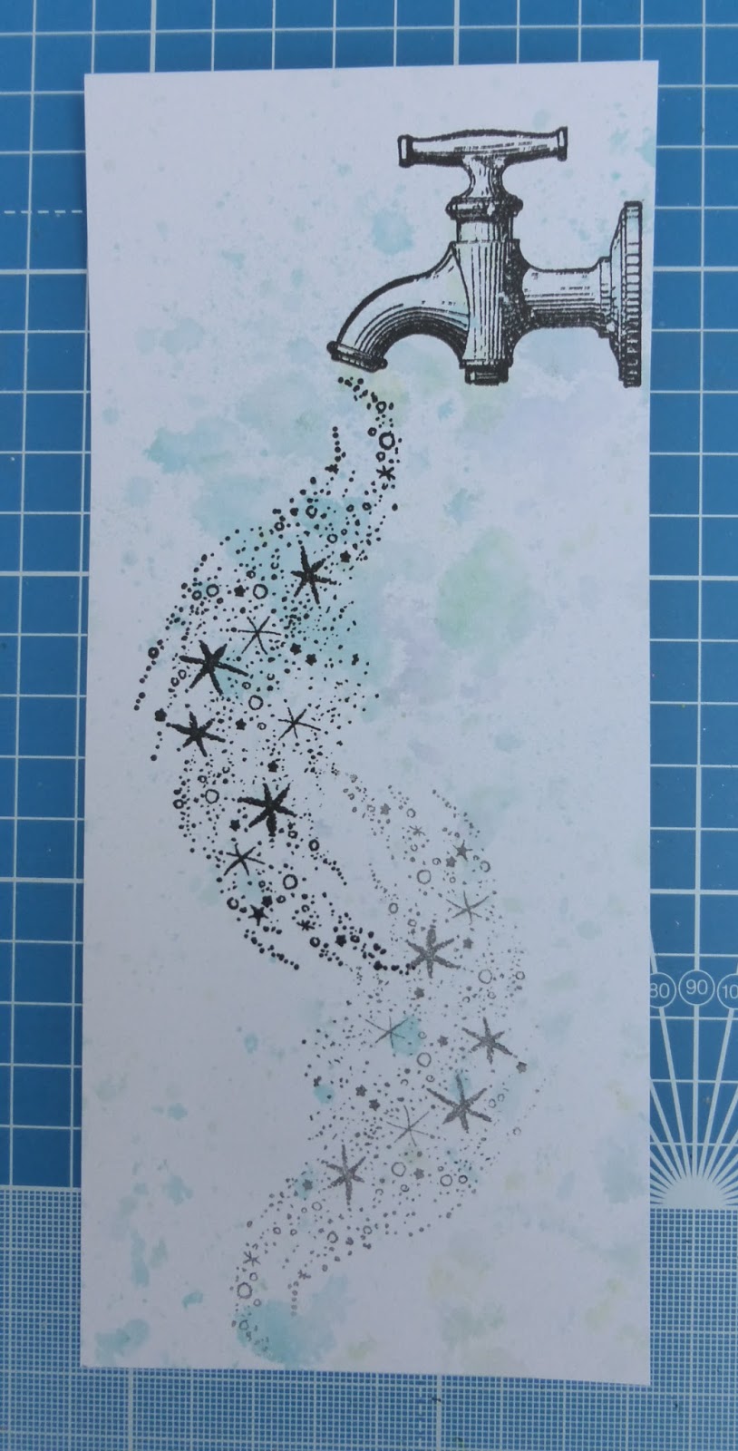 To begin with I stamped the snowflakes and the tap using stamps by Stampendous (snowflakes) and Carabelle Studio (Tap).