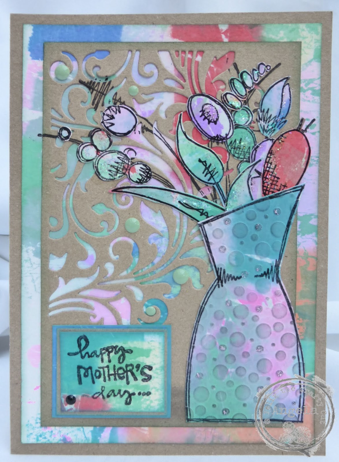 Wow! This is so gorgeous Angela! Love the background and the colours are fabulous! Brilliant idea to use kraft card especially with the die cut and the vase and flowers are amazing! Love, love, love this!! hugs xx