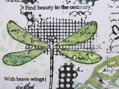 The die cut and the dragonfly's wings where made using this Masterboard which was layered up using Distress Oxides, Artistic Flair stencil, text stamp and green Gilding Foil.
