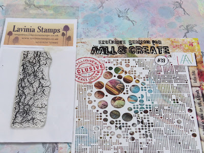 I made this card using several Lavinia stamps and one of her dies. The background is one of my own Masterboards coloured with Distress Oxides before applying the stamps.