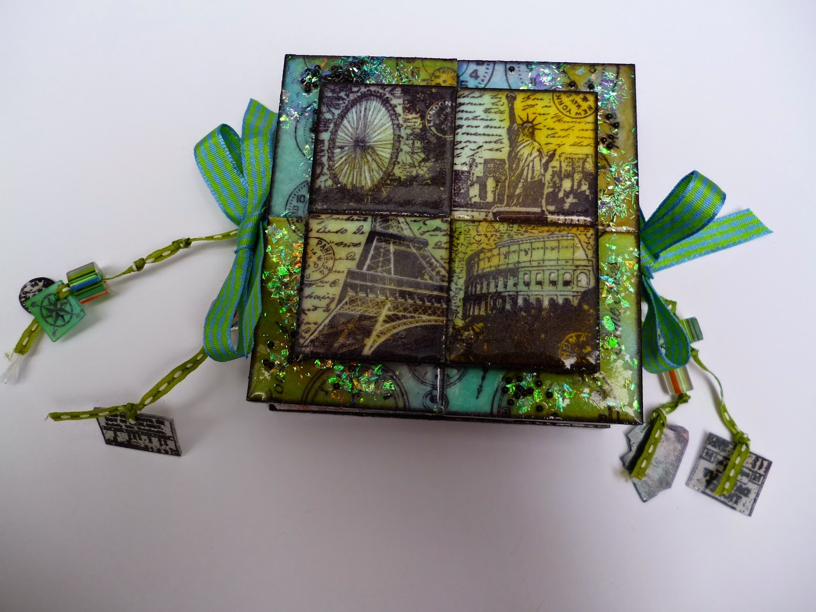 I used a larger stampbord for the cover pages stamped the clock images and then the embossing powder adding glitter during the heating process.